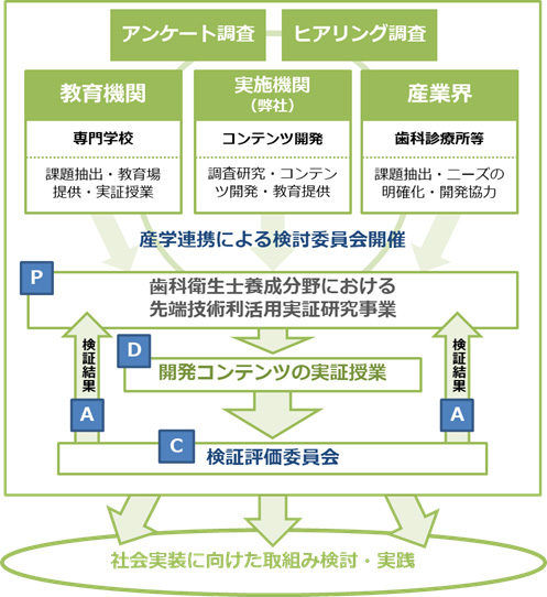 1.検証(Check) 【検証方法】 ・導入学生、非導入学生向けアンケート ・検証評価委員アンケート ・検証評価委員意見 【検証評価内容】 ・学習効果検証 ・体験効果検証 ・開発コンテンツ評価 ・理解度評価 ・導入、非導入比較検証 ・学習時間削減効果検証 ・教員負担検証 ・コスト検証 2.改善(Action) ・検証結果より課題の抽出 ・開発コンテンツの改善、修正 ・コスト改善方法検討 ・先端技術導入の有効性可視化 |